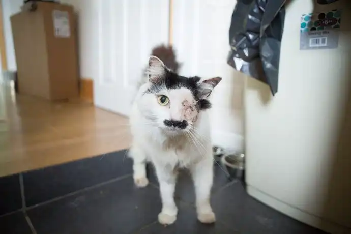 Владелица кота Кирсти Спарроу из Глостершира, Великобритания, стала волновался, когда ее питомец не вернулся домой. Сосед нашел его день спустя в мусорном контейнере с тяжелейшими травмами. Хозяйка База бросилась к ветеринару для оказания неотложной помощи. Спасти жизнь кота удалось, но левый глаз пришлось удалить, поскольку он был очень сильно поврежден.