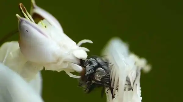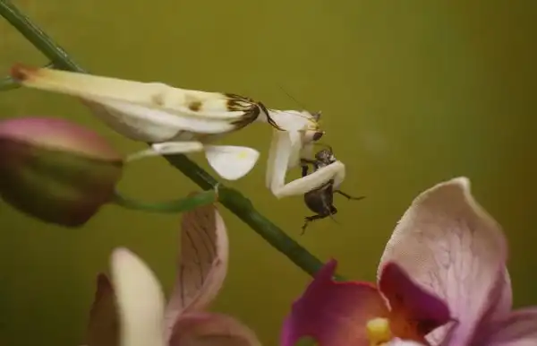 Богомолы поедают насекомых-опылителей, поэтому и заняли именно эту нишу мимикрии – они делаю вид, что жаждут опыления и хватают всех, кто летит на этот цветовой призыв: пчёл, бабочек, стрекоз, мух.