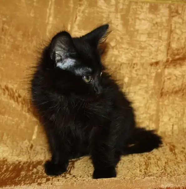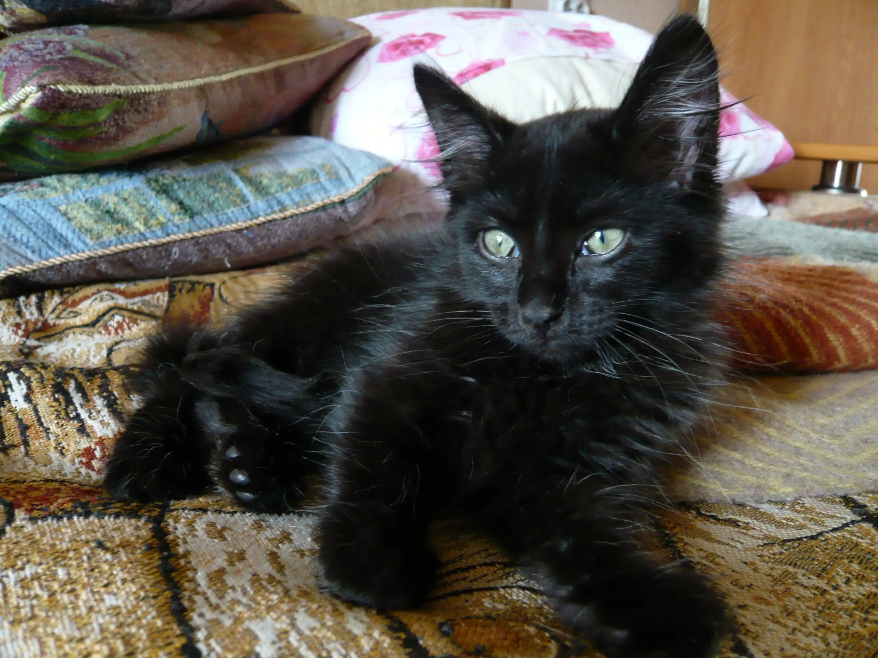 Прекрасный абсолютно чёрный (только кисточки на ушах с белым) пушистый котик 2,5 мес. Очень игривый, подвижный, громко мурлычущий, когда его гладишь, любит "поговорить"))) Но при всём этом пугливый в связи с тем, что был найден в подвале, так что доверие нужно завоевать) К лотку приучен. Ветеринаром осмотрен, блохи протравлены, глисты в процессе (повторить 30.06, таблетка есть). Если вы хотите иметь дома прекрасное создание, которое будет вам поднимать настроение, то это ваш шанс.