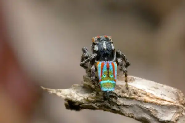Такая раскраска наблюдается не только у пауков. У многих видов самцы очень яркие, а самки серые и непритязательные. Паук павлин обитает главным образом в австралийских штатах Новый Уэльс и Квинсленд. У самцов также есть две округлые складки по бокам живота, которые они расправляют во время своего танца. Именно поэтому их и назвали павлинами
