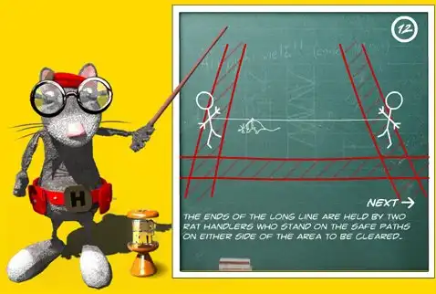 Вместо ковша приспособлен нож для резки кустов. Экскаватор очищает территорию от лишней растительности. Участок разбивают на квадраты, протягивают маркировочные шнуры, оставляют узкие дорожки для прохода. Каждый квадрат проверяют дважды: следом за первой крысой пускают вторую. Подозрительные места отмечают прищепками на маркировочных шнурах. В конце дня, после проверки этих мест сапером с миноискателем, найденные мины взрывают.