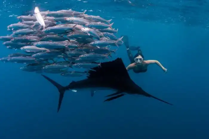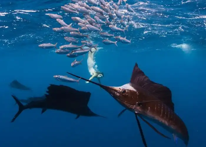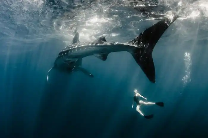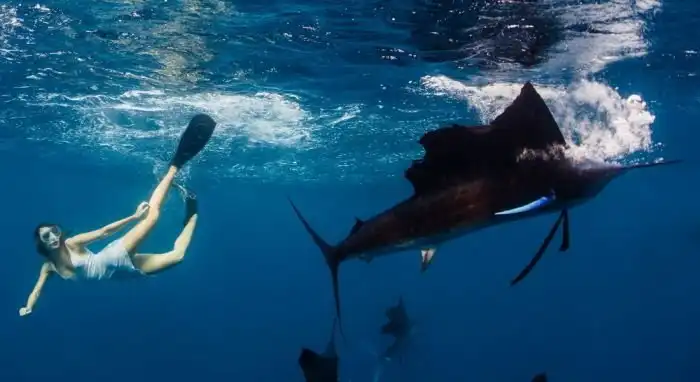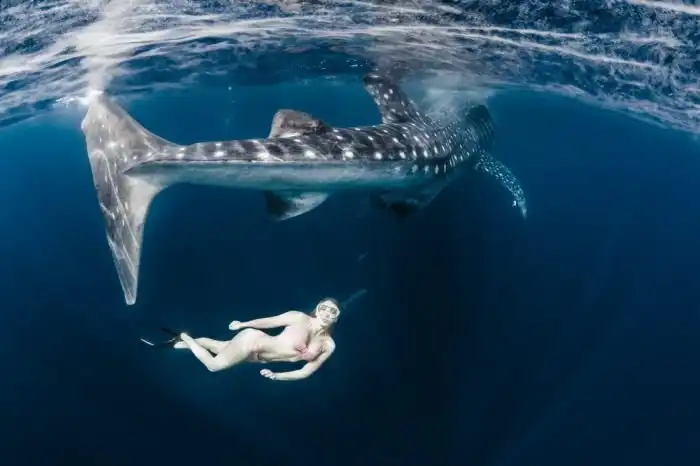 Эта невероятная подводная фотосессия была сделана неподалеку от острова Исла-Мухерес, который находится у Северного полуострова Мексики. Фотомодель Роберта Манчино погрузилась в холодные воды океана в феврале 2014 года, чтобы сделать коллекцию снимков с китовыми акулами, скатами и даже самым быстрым и опасным обитателем океана на планете - рыбой-парусником.