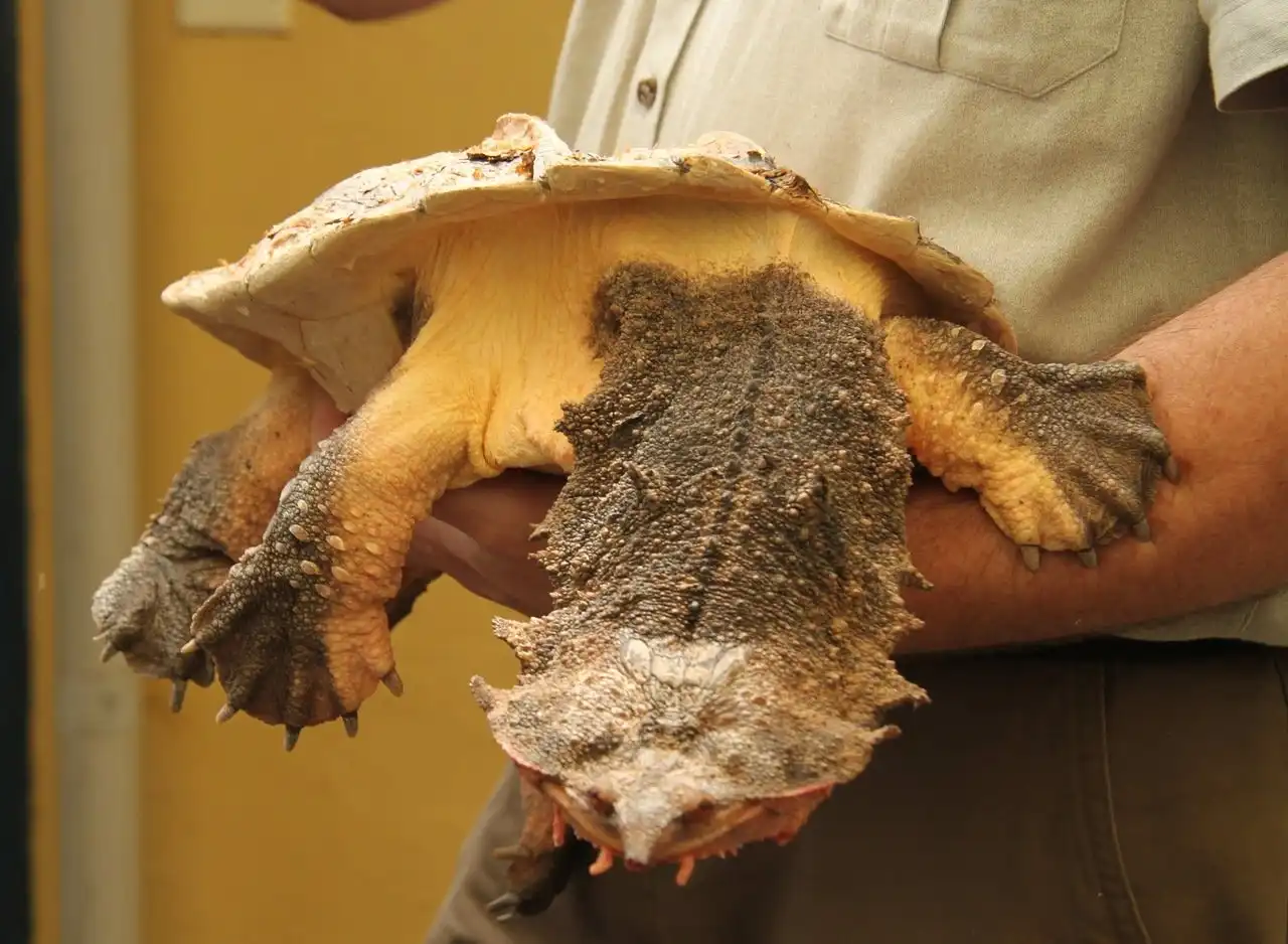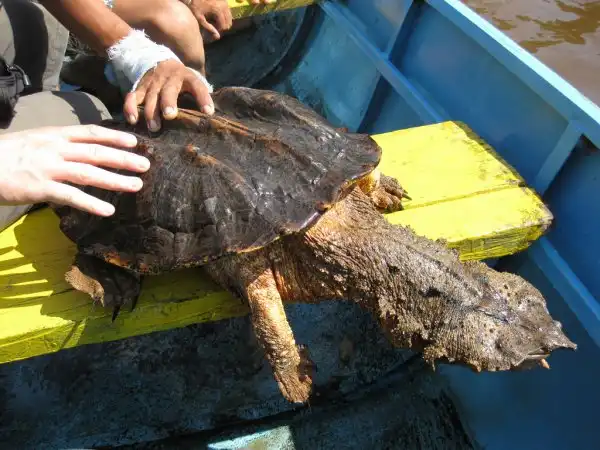 Этот хищник, к счастью, питается только рыбой, которая, наверное, впадает в транс только от вида этого чудовища, достигающего в длину 50 сантиметров и весом более 10 кг. На людей пока что черепаха не нападает.