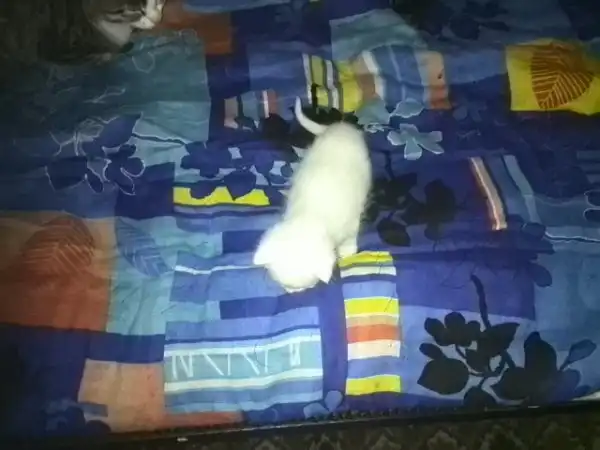 Родилась 10 августа от домашней кошки. Обладательница красивой белоснежной шубки без единого пятнышка. Крошка прекрасно обучается от мамы кошачьим премудростям.