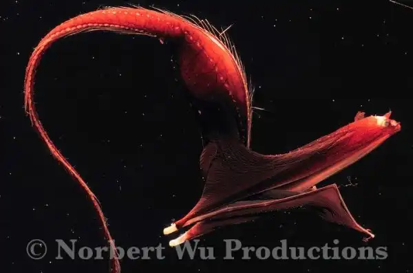 Прячась в темноте, подобно затаившейся в засаде змее, большерот привлекает маленьких рыб соблазнительным светом пульсирующей приманки — «фонариком» на хвосте.