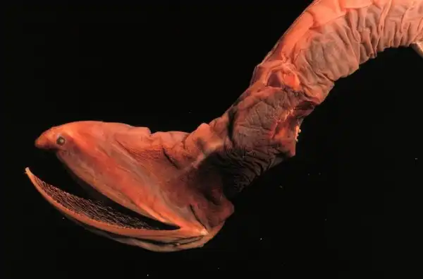 Большерота еще иногда называют рыбой-пеликаном. Большерот обычно водится в тропических зонах океанов на глубине не выше 500 и до 3000 метров. Рыба обладает длинным и достаточно узким телом. Внешний ее вид напоминает угря, из-за чего рыба получила еще одно прозвище — пеликаний угорь. Если внимательно посмотреть на рыбину, то нетрудно догадаться – почему пеликан. Дело обстоит в растягивающейся глотке, которая напоминает сумку под клювом у пеликана.