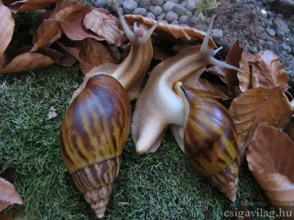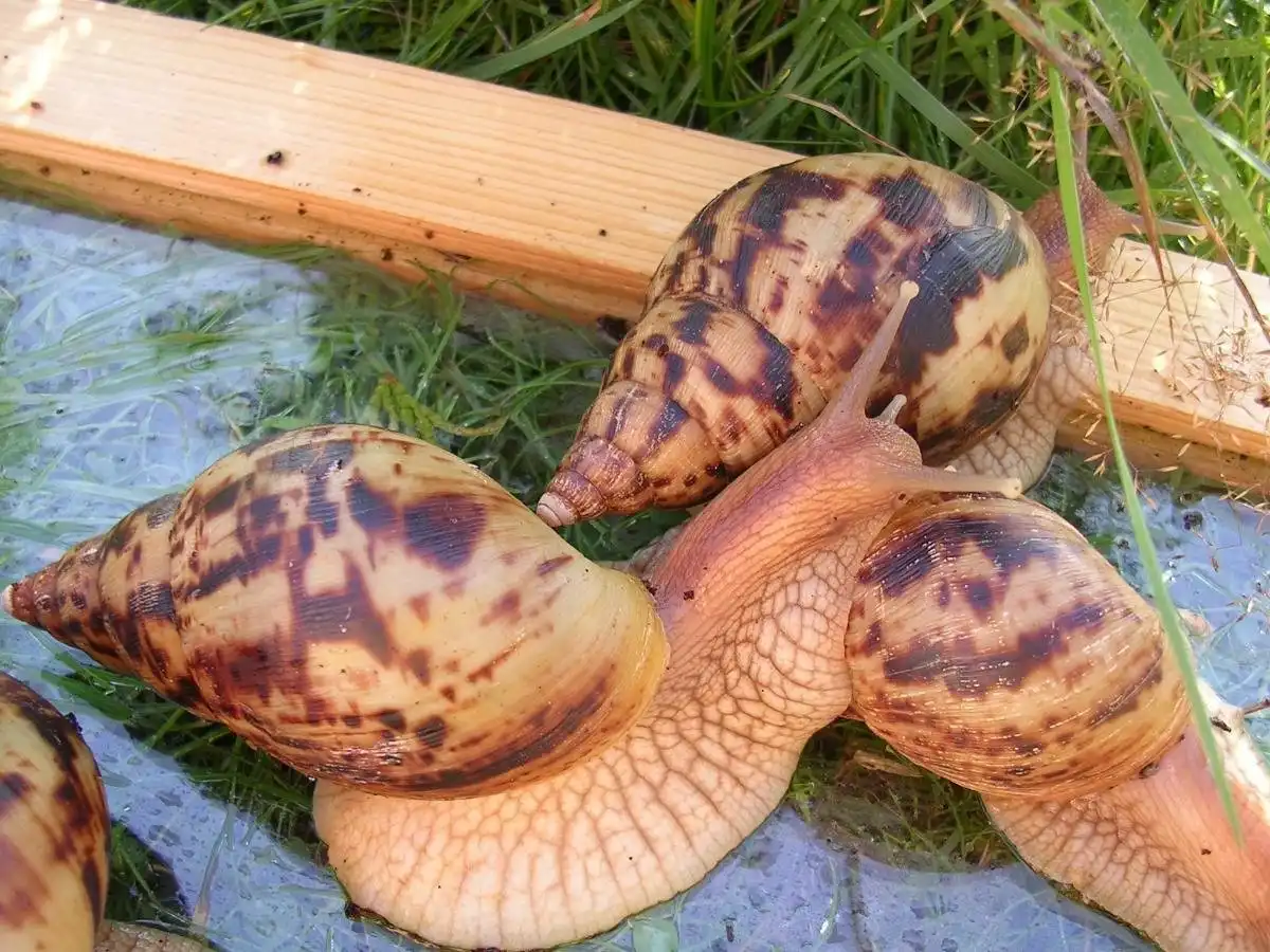При разведении ахатин, судя по всему, нет вообще никаких проблем. Человек, подаривший моей подруге улитку, признался, что он и сам того не зная стал «заводчиком». Дескать, было в аквариуме две улитки. А заглянул как-то — там уже десять сидит. Причём десять — сказано достаточно скромно, т.к. одна ахатина способна отложить 100-200 яиц, из которых выживает примерно половина. При этом, уже через 2-3 недели появляется молодь, а через 1,5 месяца молодь становится взрослой. Из этого видно, что улитки способны размножаться просто гигантскими темпами и становится ясно, почему они являются бедствием в странах с климатом, благоприятным для их жизнедеятельности.