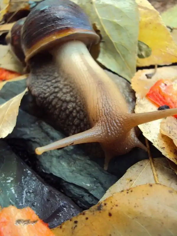 Гигантская улитка Ахатина (лат. Achatina fulica) - самый крупный сухопутный моллюск. С конца 18 века эти огромные (до 30см) улитки широко распространились по тропическим и субтропическим широтам планеты.