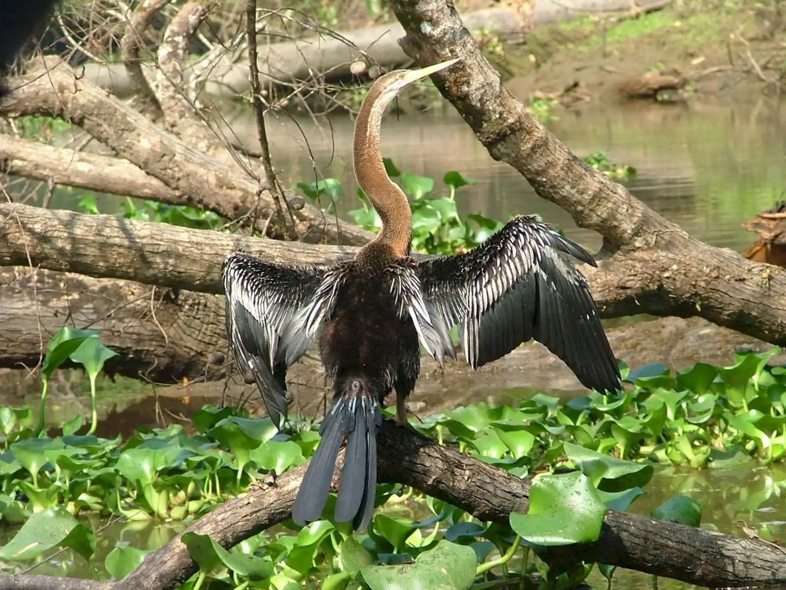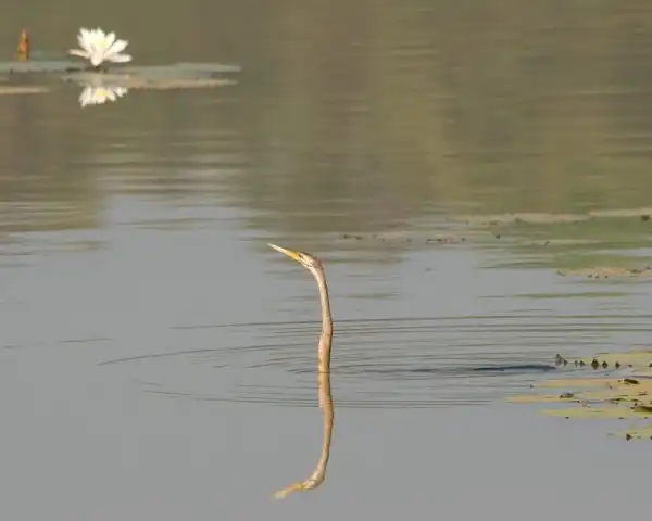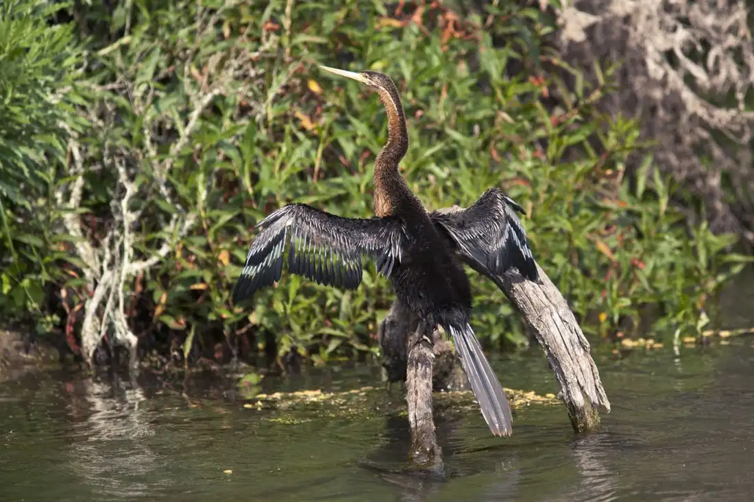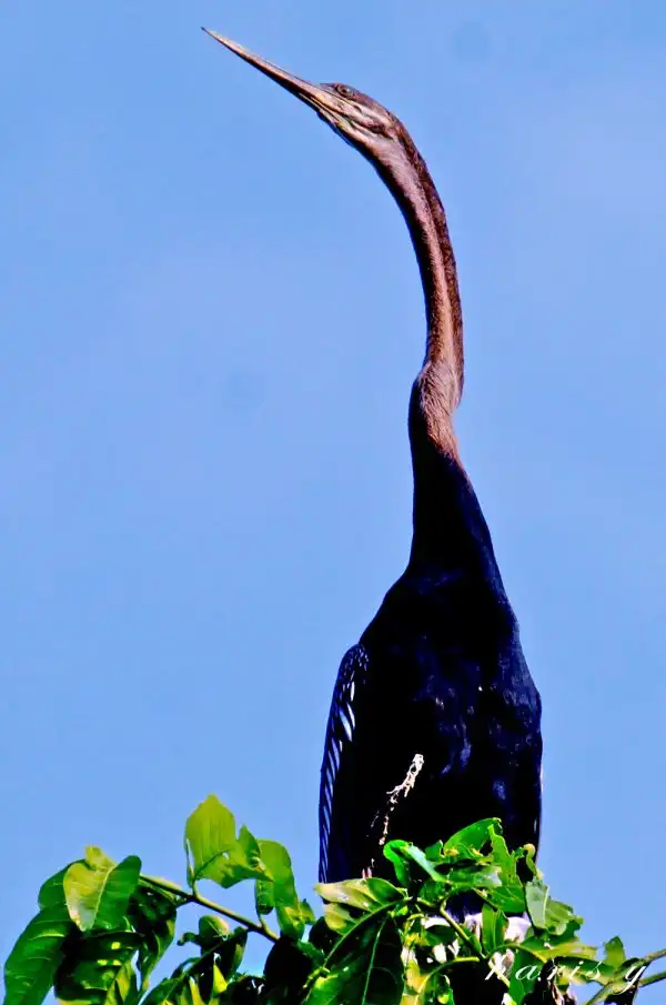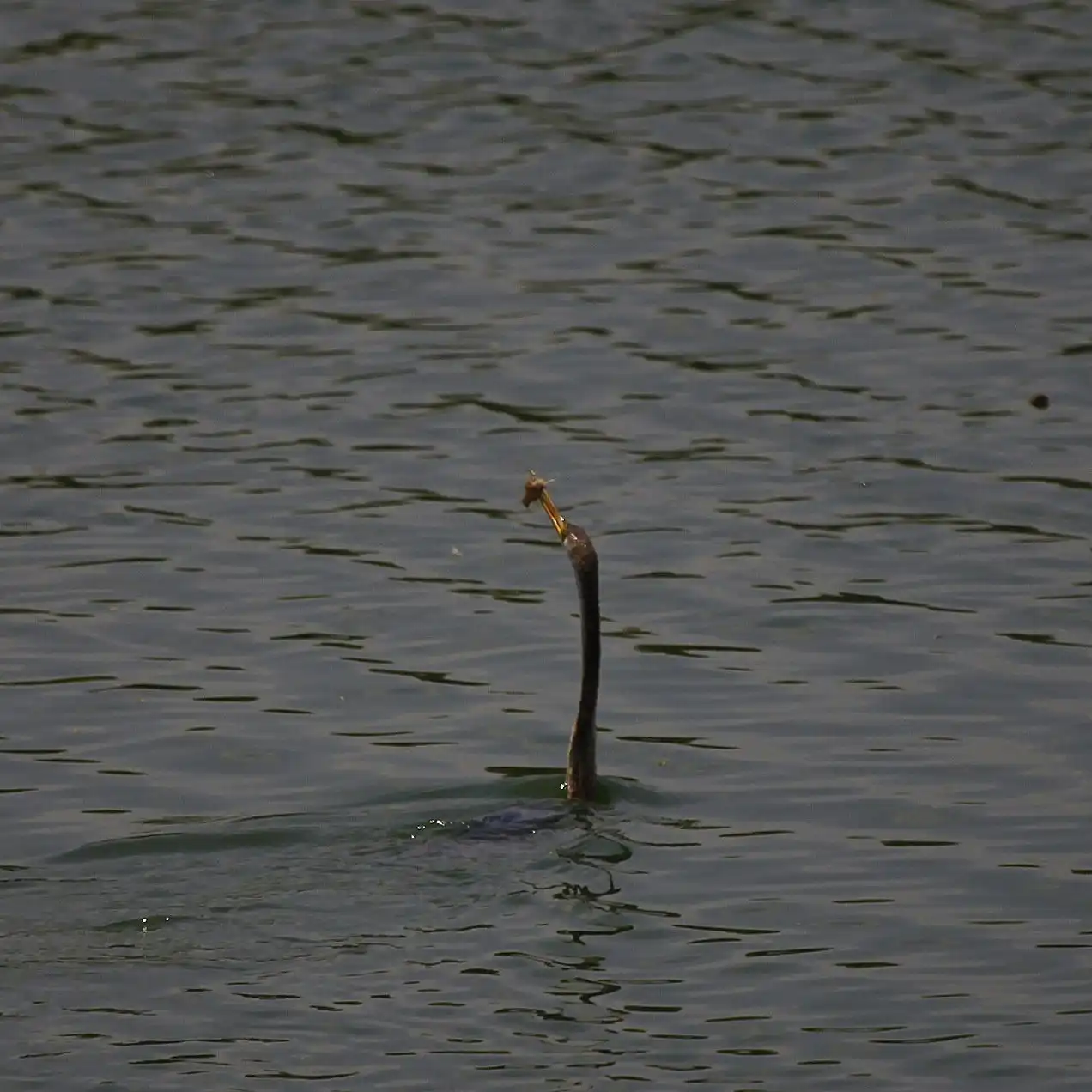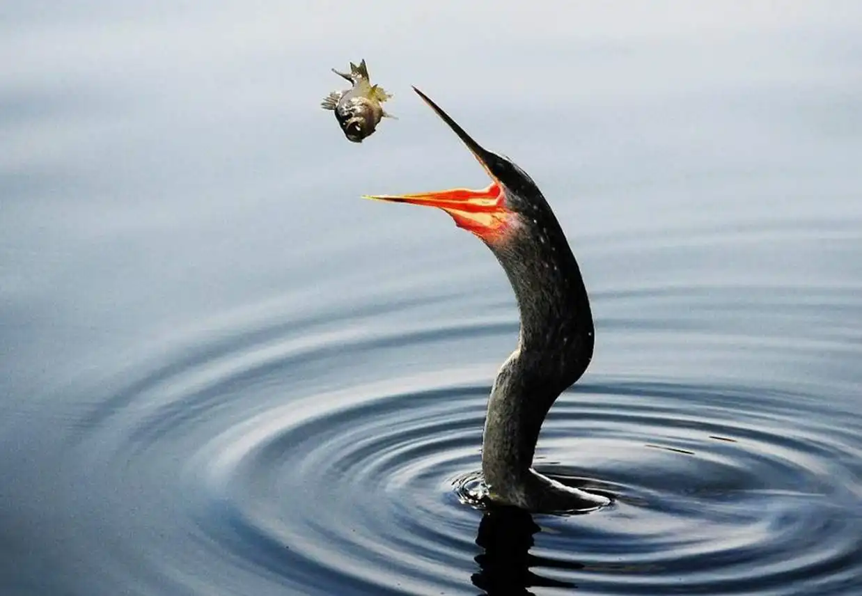 • Чтобы съесть свой улов, змеешейка резко дергает шеей, подбрасывая его из клюва в воздух. Если это рыба, то ее следует подбросить так, чтобы птица могла проглотить ее головой вперед. Молодым и неопытным змеешейкам этот этап охоты часто дается нелегко.