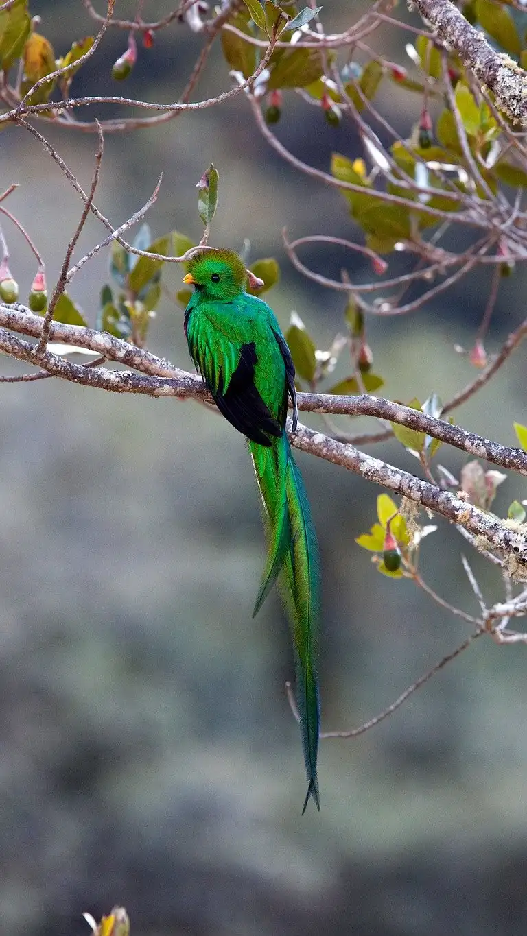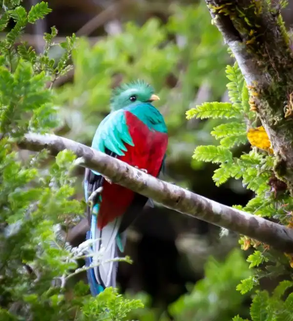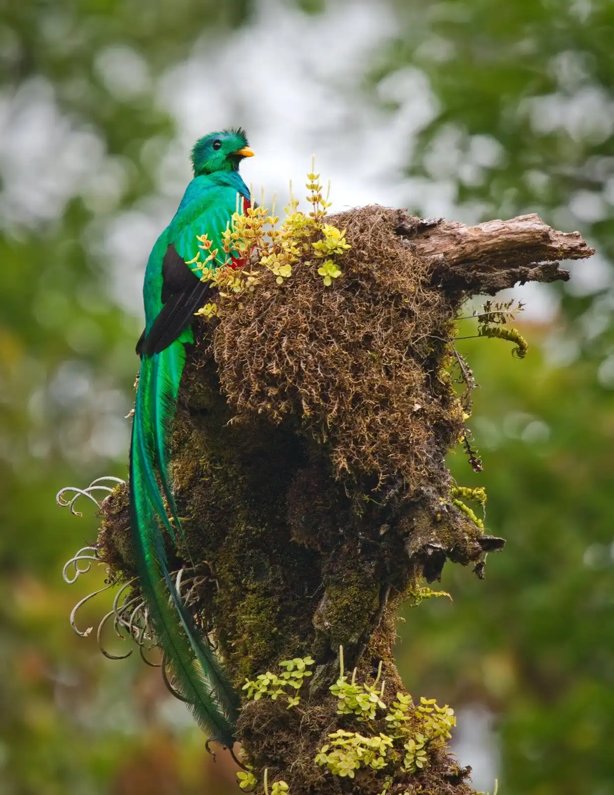 Лучшее место для наблюдения за скрытными квезалями — в лес ном пологе, образованном фруктовыми деревьями, куда за едой прилетает самец.