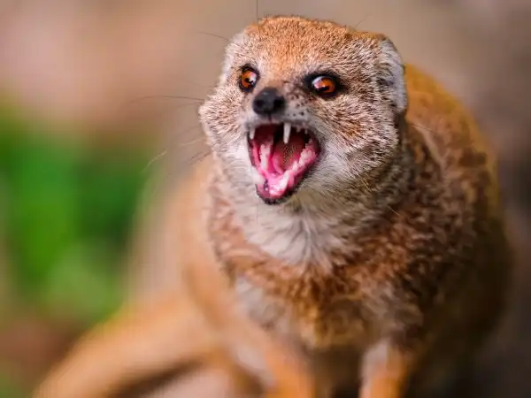 Камуфляжная окраска делает мангустов невидимыми среди камней и кустарников, служа главным средством защиты, а от опасности они, как правило, спасаются бегством. Впрочем, отваги и решительности им не занимать, и при виде врага зверёк выгибает спину горбом, его хвост, словно боевой флаг, взмывает вверх, а торчащая дыбом шерсть увеличивает его чуть ли не вдвое, отпугивая возможного противника. Загнанный в угол мангуст яростно лает и рычит, кусается и выстреливает во врага резко пахнущий секрет анальных желез.