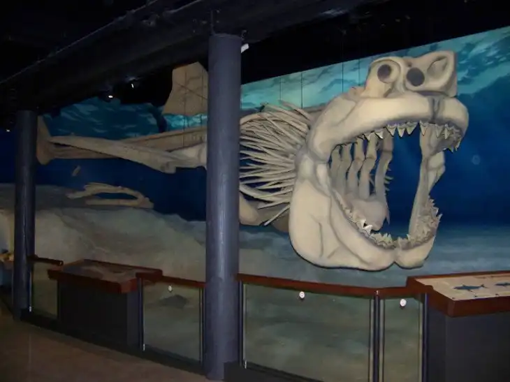 При создании экспоната учёные выбрали самые крупные зубы из залежей окаменелостей по всему миру, и это отразилось на размерах. Пасть вышла огромной, и количество зубов в ней казалось чрезмерным. Тщательно исследовав окаменелости, современные учёные, благодаря новым достижениям в биологии, всё же смогли правильно расположить все зубы. В итоге получилась пасть высотой 2 метра и шириной более 2,5 метров. В неё помещается 276 очень крепких и плотных зубов с зазубринами, которые располагались в 5 рядов. При таких размерах челюстей, принято считать, что мегалодон мог достигать 17-20 метров в длину и весить, как бы трудно не казалось это представить, 45 тонн.