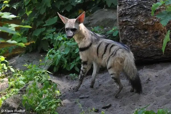 Окрас: Земляной волк имеет желто-белый мех, который более бледен на горле и нижних участках тела. Морда черная и почти лысая (безволосая). На теле животного есть несколько (обычно пять-шесть) вертикальных черных полос. Хвост густой и окрашен в черный цвет. Ноги также черные.