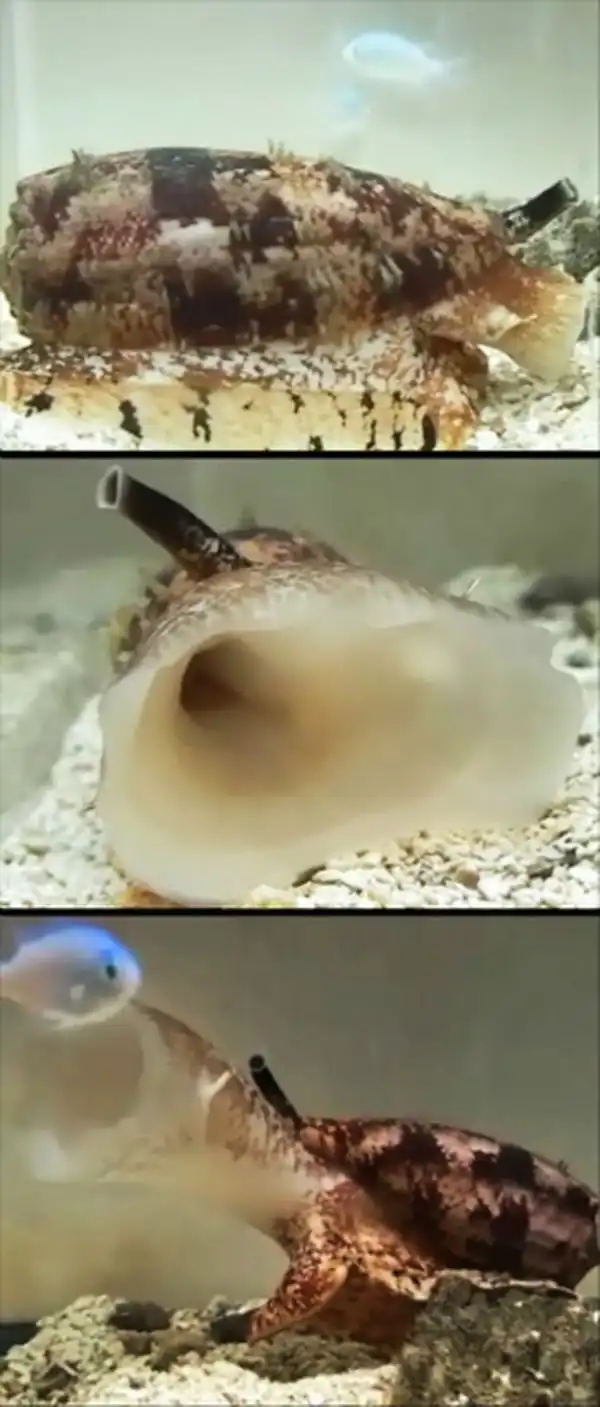 Маленьких рыбок моллюски заглатывают сразу, а на больших натягиваются словно чулок.