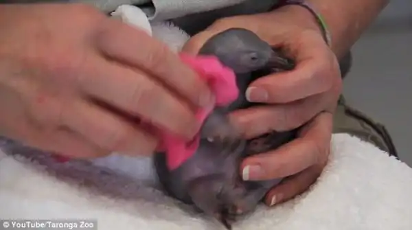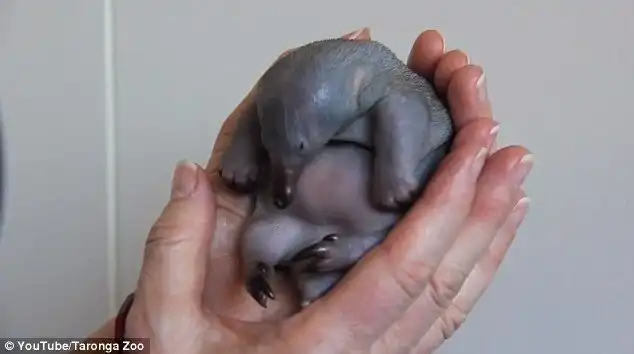 Детеныш ехидны, которому месяц от роду, выпал на пешеходную дорожку из маминой сумки. На его счастье малыша подобрал прохожий и отнес в зоопарк Сиднея. Там его кормят молоком из пипетки и через несколько месяцев детеныш превратится в настоящую ехидну.