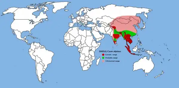Основная часть ареала приходится на Центральную и Южную Азию, южную половину Восточной Азии, включая Индию, Индонезию, Китай, Тибет, Монголию, острова Суматру и Яву. В пределах ареала вид местами истреблён или вытеснен человеком, местами отсутствует на значительных пространствах и без вмешательства человека (в основном, это пустынные и степные части ареала). Северная граница ареала проходит узкой полосой по территории России — это юг Дальнего востока, Восточной и Средней Сибири. Всюду здесь красный волк очень редок.