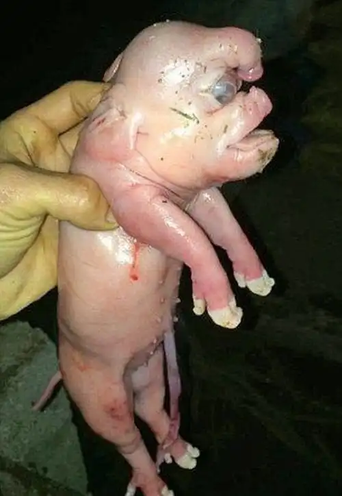 В небольшом поселке под китайским городом Наньнин свинья фермера Тао Лу родила 19 поросят, последний из которых оказался настоящим мутантом. Морда животного была сильно деформирована, и ее даже сравнивали с человеческим лицом.