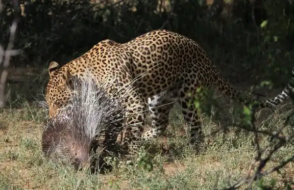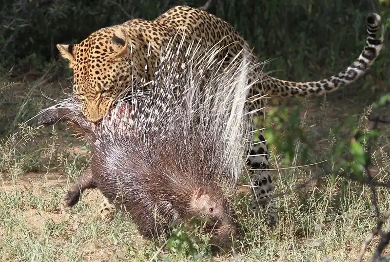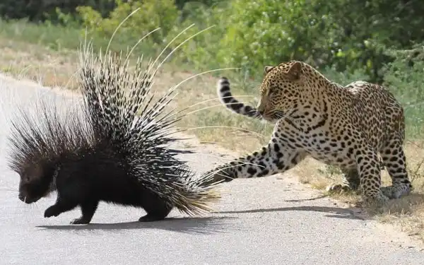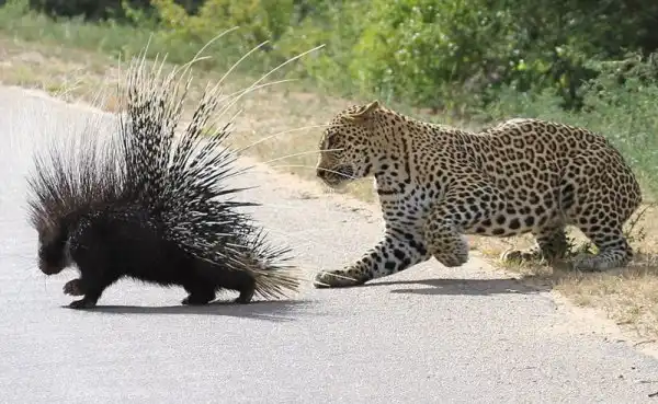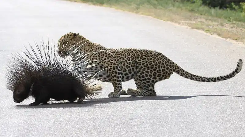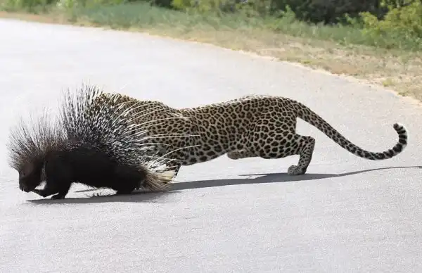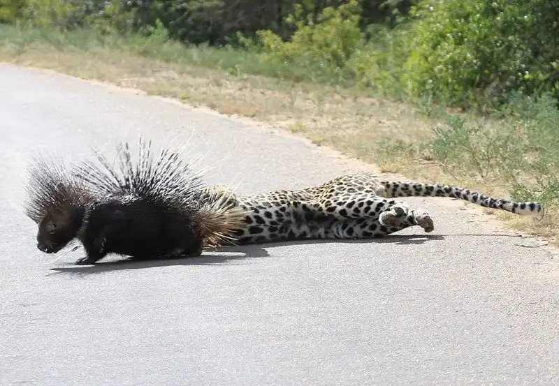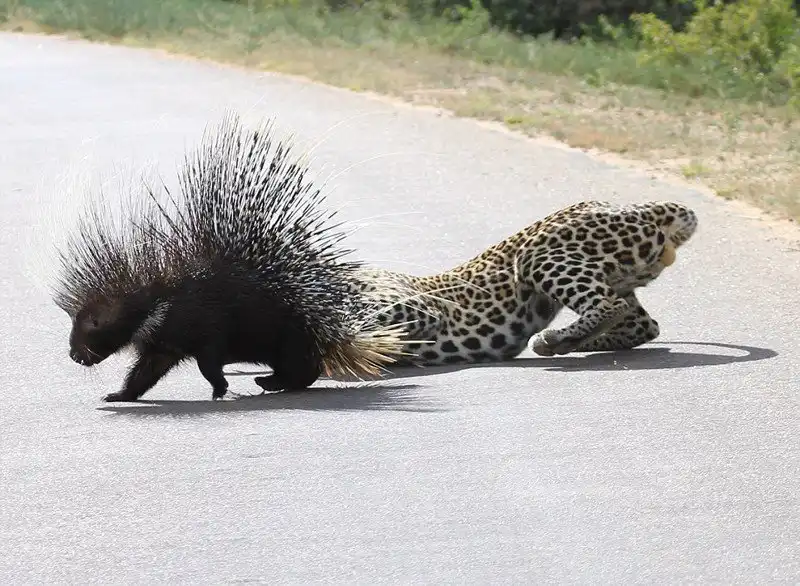 Леопард отдыхал на дереве возле дороги в национальном парке Крюгера в Южной Африке, когда появился дикобраз. Леопард захотел полакомиться свежей дикобразинкой, но после ряда попыток атаковать, он лишь получил несколько иголок в нос и лапы, и убрался ни с чем. Эти кадры снял Yusuf Chavoos, когда ехал по дороге через парк.