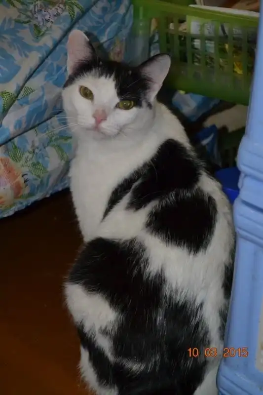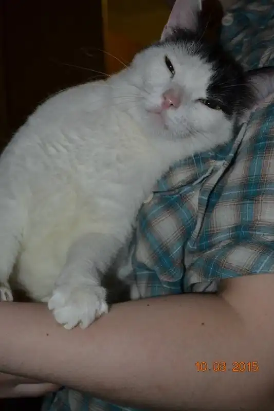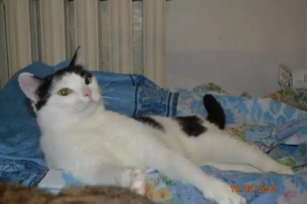 Бело черный кот мальчик ему 1,5 года, очень ласковый, это видно даже из фото, еще ко всему он игривый как котенок, активный и любознательный, ест сушку, ходит в лоток, кастрирован.