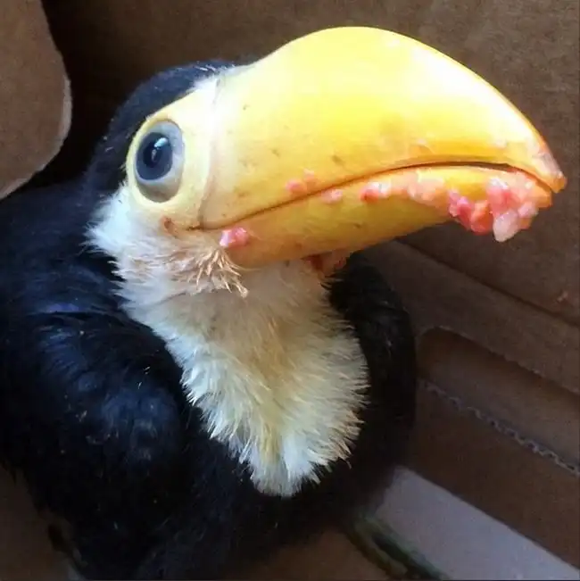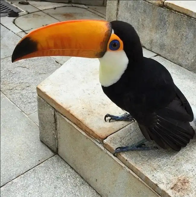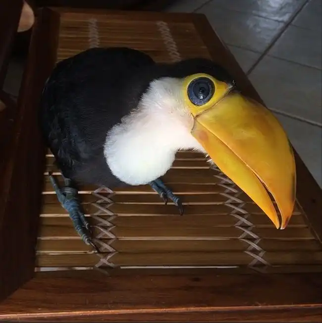 Это птенец тукана. Птица широко распространена в тропических лесах Центральной Америки, а также встречается в некоторых странах Южной и Северной Америки. Туканы всеядны, но предпочитают употребл*ть в пищу свежие плоды. Могут также питаться насекомыми, яйцами других птиц или даже ящерицами. А вы бы рискнули завести такую птицу у себя дома?