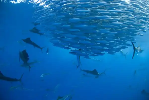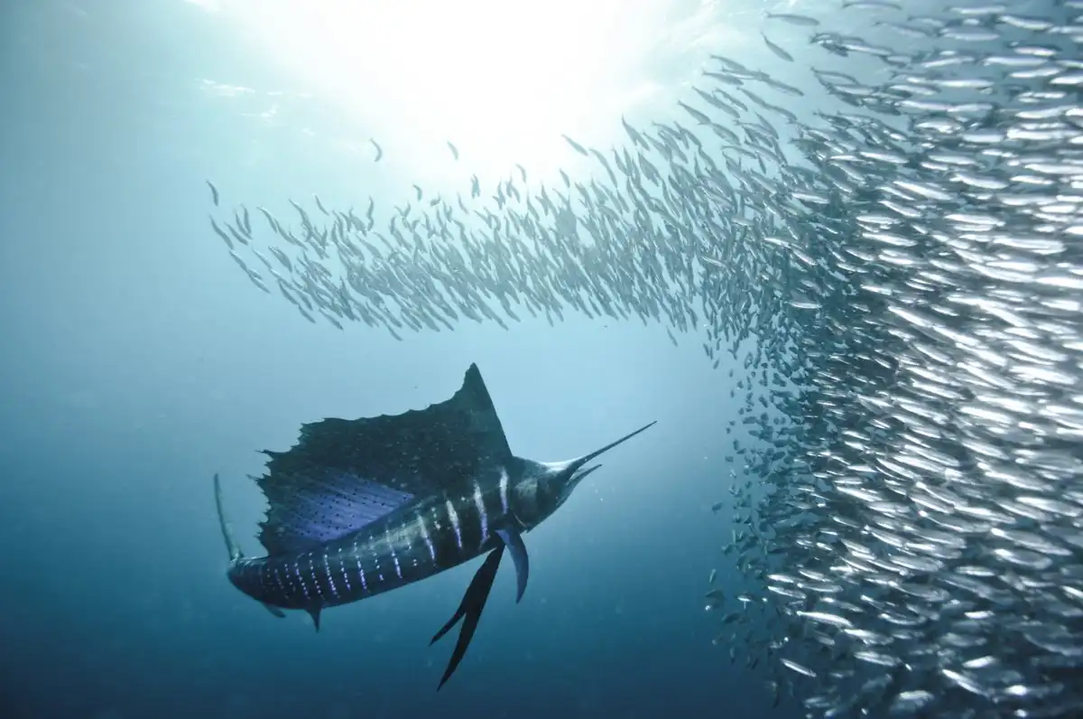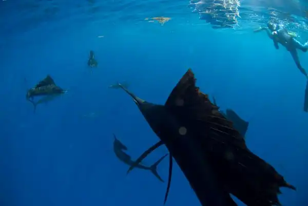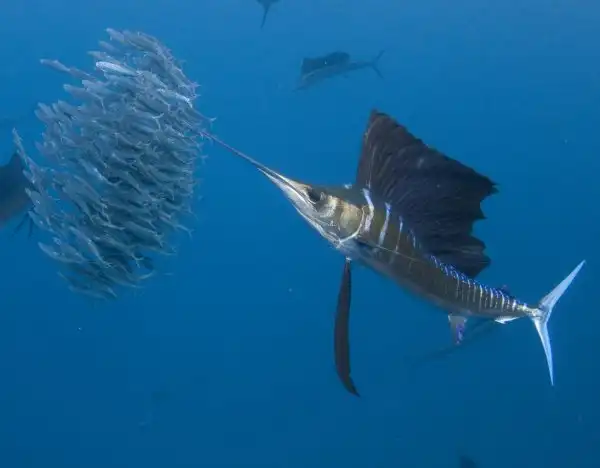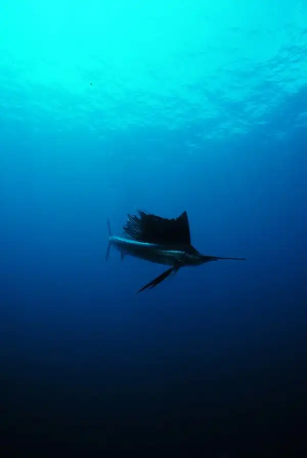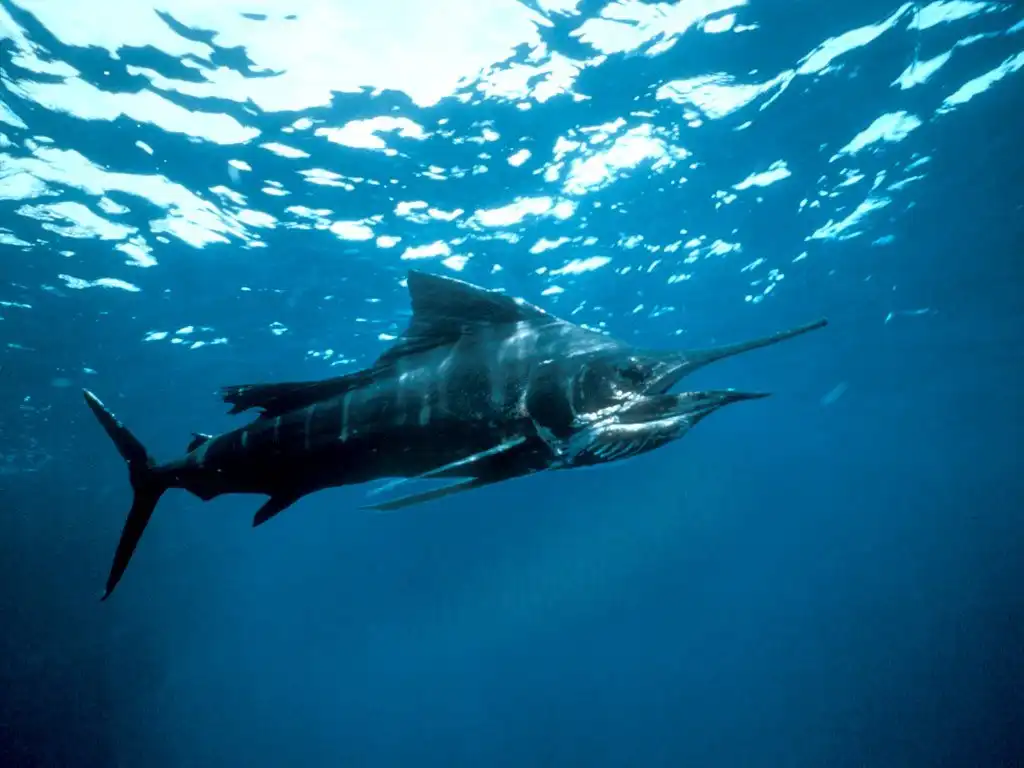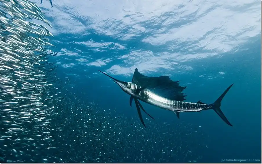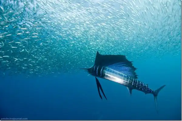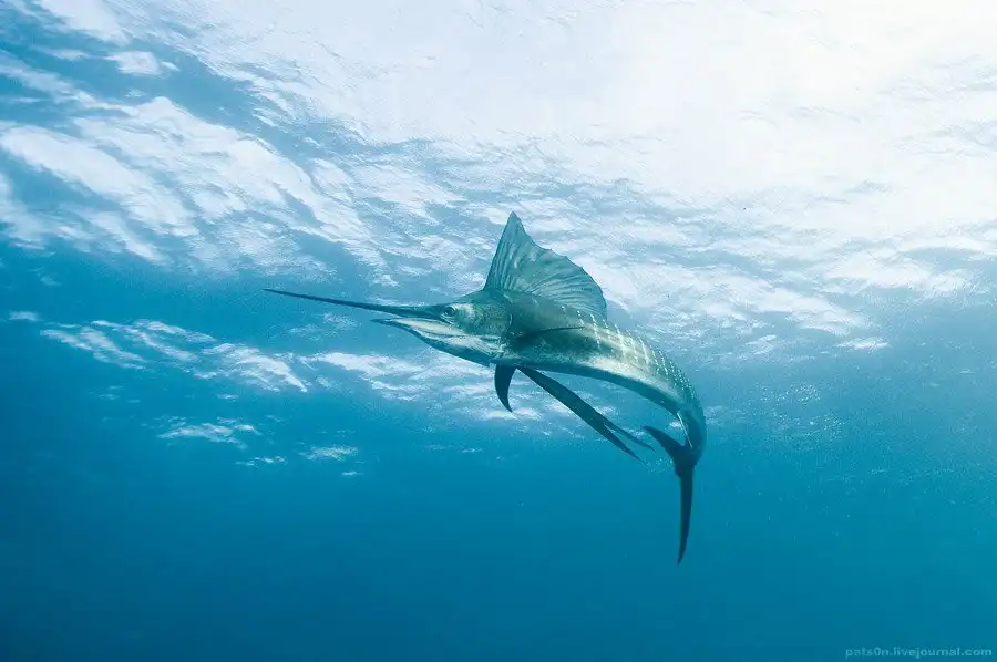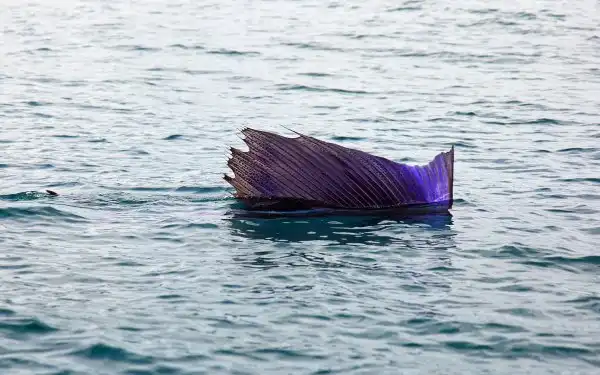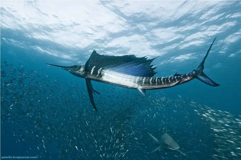 Размеры Парусника могут превышать три метра, а вес – около ста килограмм. Главная отличительная особенность самой быстрой рыбы в мире – большой спинной плавник похожий на парус.
