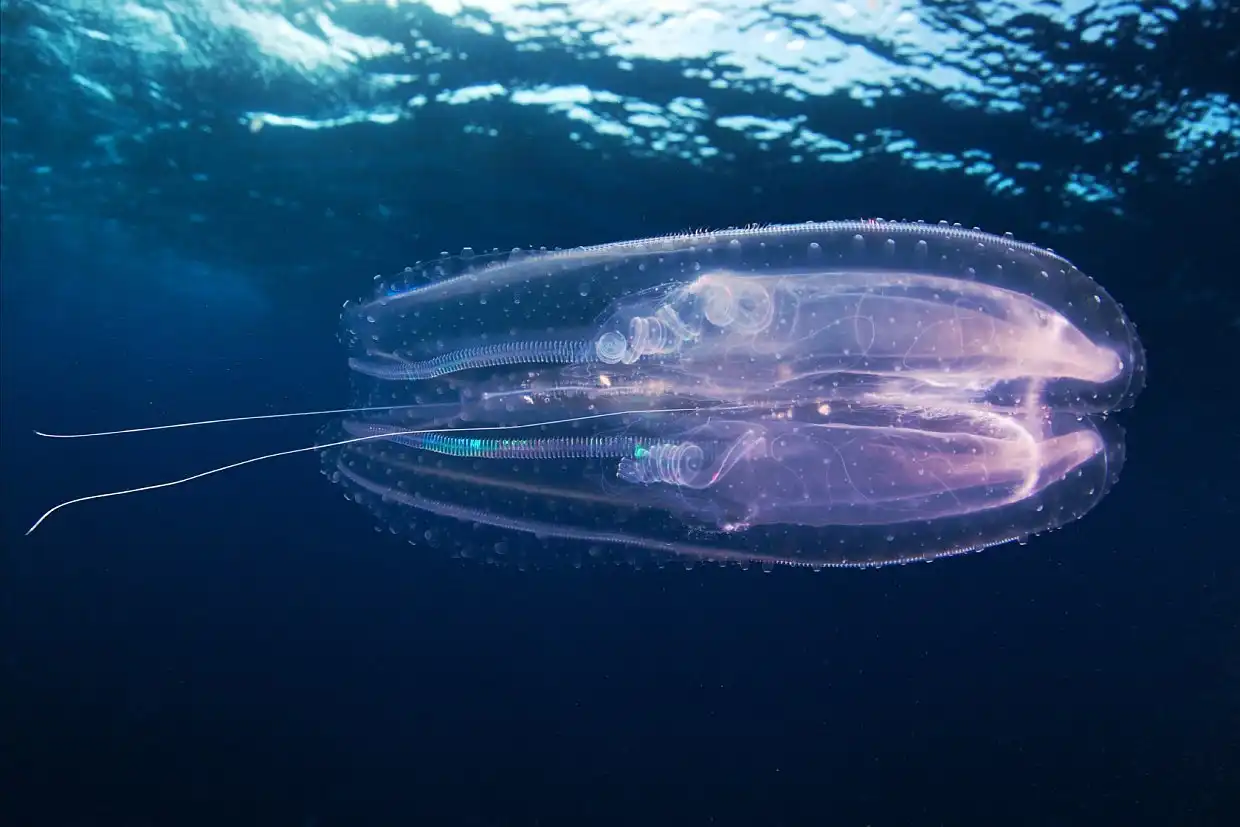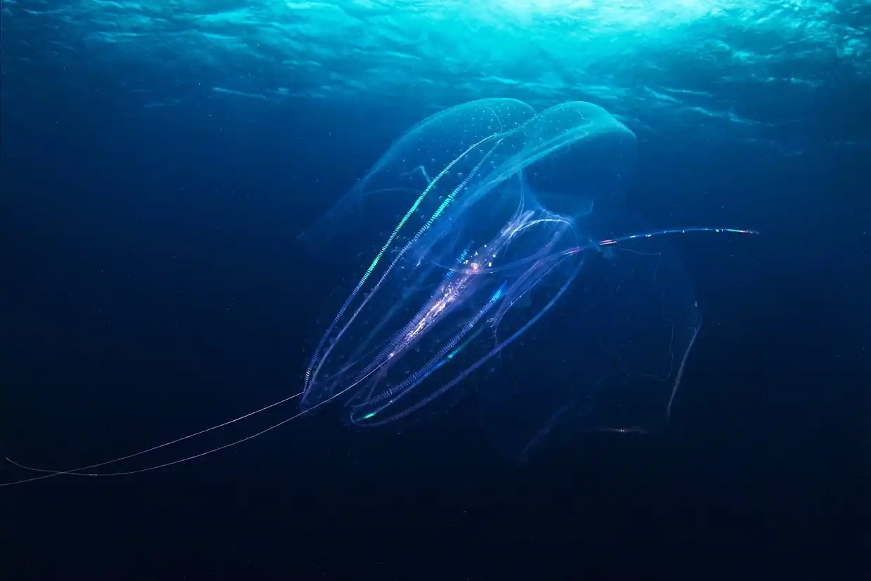 Фантастически красивые гребневики, которые медленно парят в толще воды, распахнув огромные ротовые лопасти и орудуя четырьмя толстыми щупальцами.