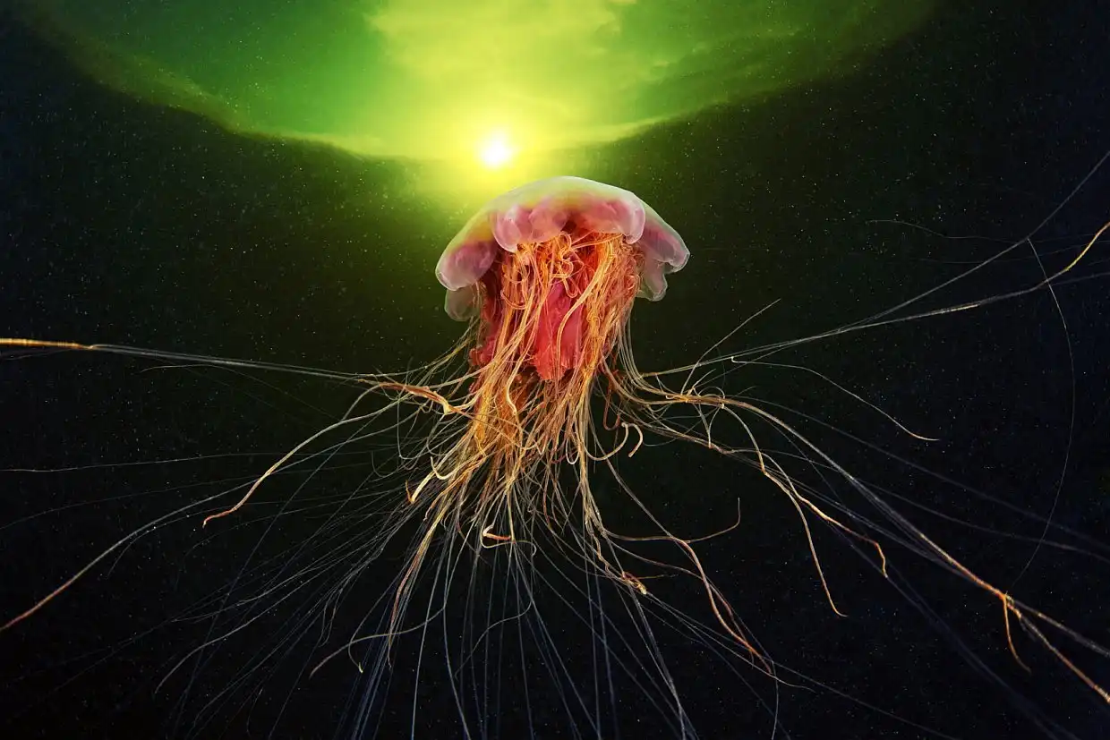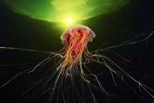 Волосистую цианею (Cyanea capillata) еще называют Львиной гривой из-за эффектных, волочащихся за ними щупалец.