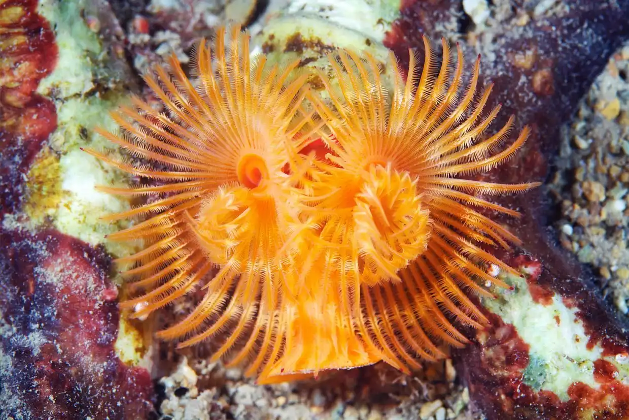 Это довольно крупные черви, которые живут в толстых известковых трубках, приросших к камням. Из трубки торчит 3-4 сантиметровый венчик щупалец, которые одновременно и жабры и ловчая сеть для проплывающей мимо съедобной органики.
