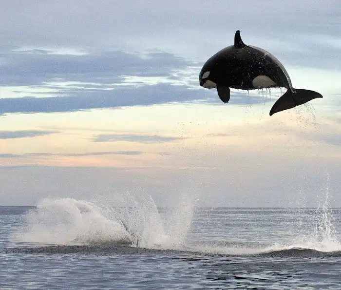 Подобно дельфинам касатки любят высоко выпрыгивать из воды, и даже их огромный вес не мешает им совершать подобные прыжки. На этих фото запечатлена 8-тонная касатка, которая подражая преследуемому дельфину, выпрыгивает из воды на 5 метров.