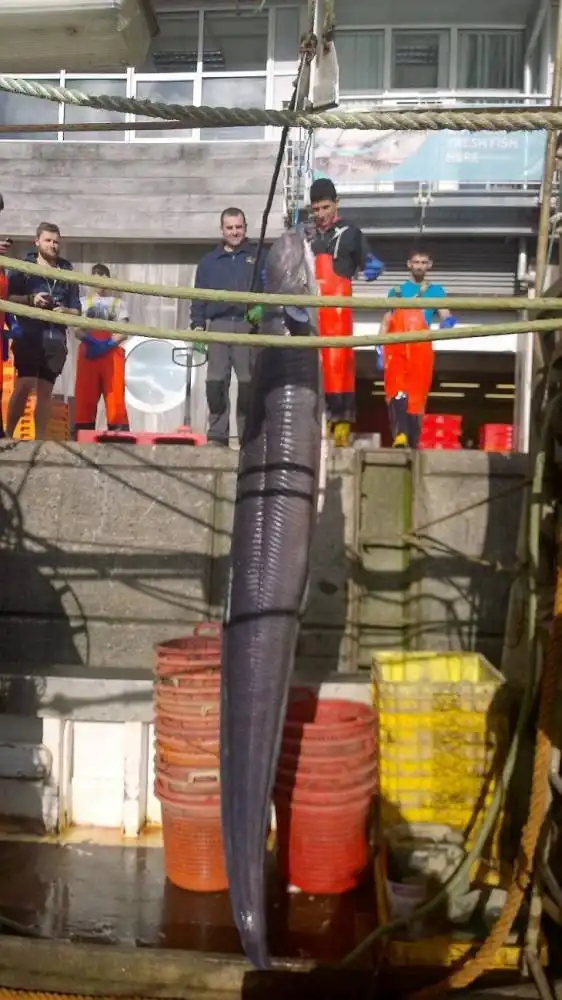 Это реальный, побивший все рекорды морской угорь, выловленный рыбаками из Девоншира (Британия). Вес чудовища – почти 60 кг, а длина – больше 6 метров. Настоящий рыбацкий джекпот!