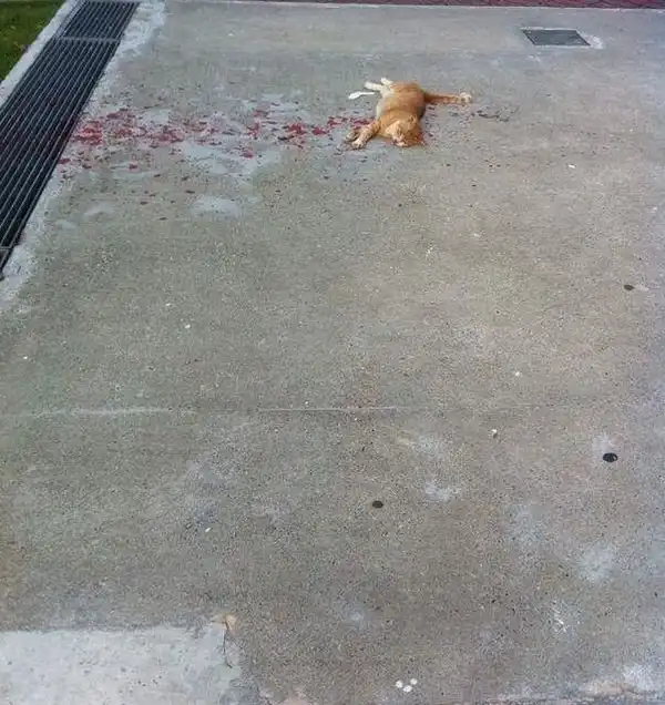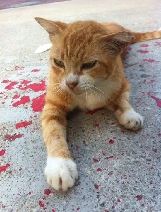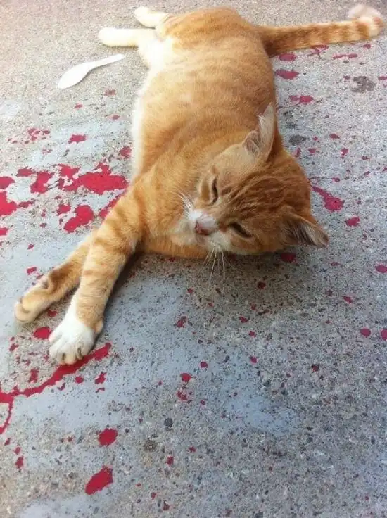 Оказалось, что кошка, всего навсего, прилегла отдохнуть, в то время как под ней оказалась какая-то засохшая краска.