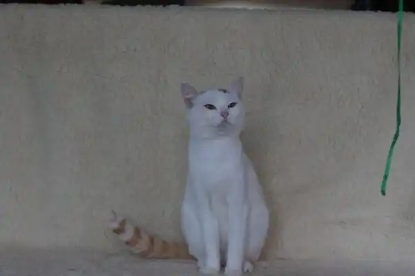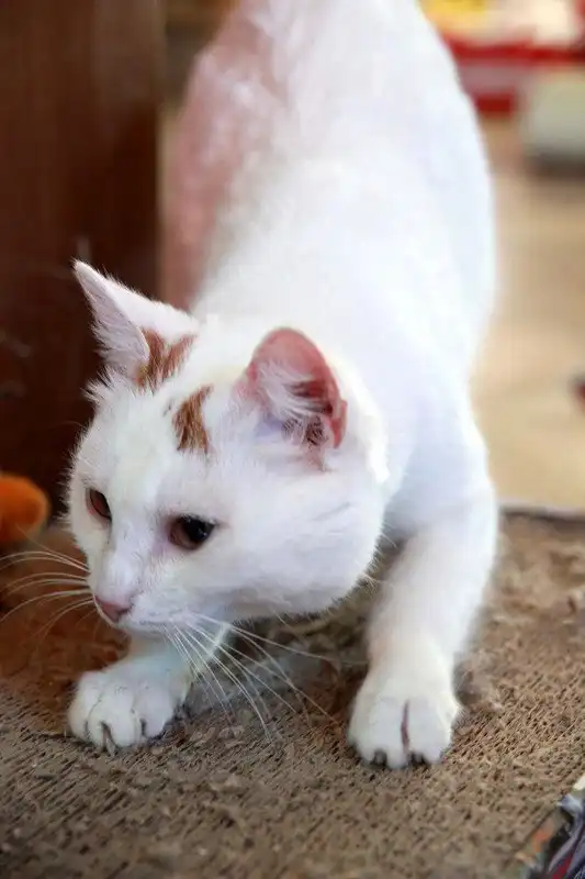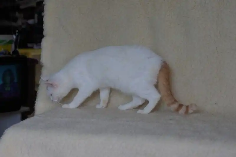 Лёва - белый котик с рыжим хвостиком и рыжими пятнышками на голове. Возраст 1,5-2 года. Выловлен из подвала. Активный, ласковый, игривый молодой кот, но не любит соседства других кошачьих, может быть к ним агрессивен. Людей и внимание к себе очень любит. Отдается единственным любимцем в дом. Питается готовыми кормами, пользуется лотком. Кастрирован.