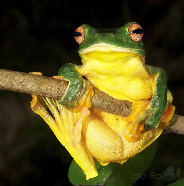 Тем не менее не только крупный размер позволяет отличить чернолапого веслонога от его собратьев, но и черный окрас лап. Тело этой лягушки ярко-зеленого цвета, как и у многих других веслоногих лягушек.