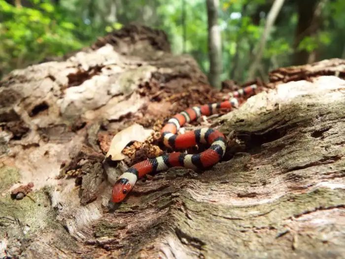 Эта ужеобразная неядовитая змея отлично маскируется под коралловую змею, укус которой смертелен. Именно поэтому немало людей боятся этих змей.