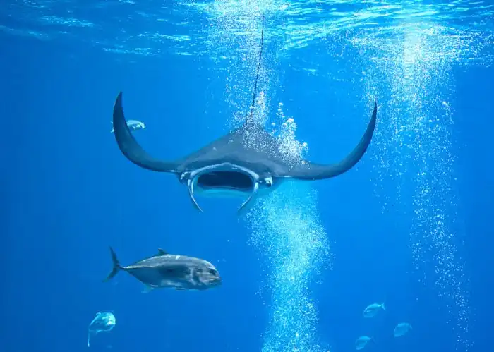 Огромные размеры (ширина до 7-ми метров при массе в 2,5 тонны), а также широкая пасть способны испугать любого малоопытного ныряльщика. Но для человека эта рыба не опасна, так как питается она планктоном.
