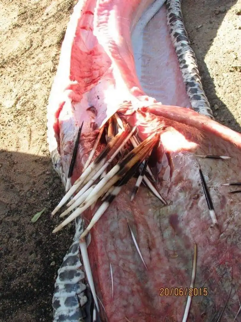 Питоны, как известно, всеядные хищники, могут даже крокодила проглотить, и хоть бы хны. Разве что перевариваться будет дольше. Однако, этот африканский горный питон все-таки погорячился, перекусив дикобразом. С такой острой пищей его желудок не справился.
