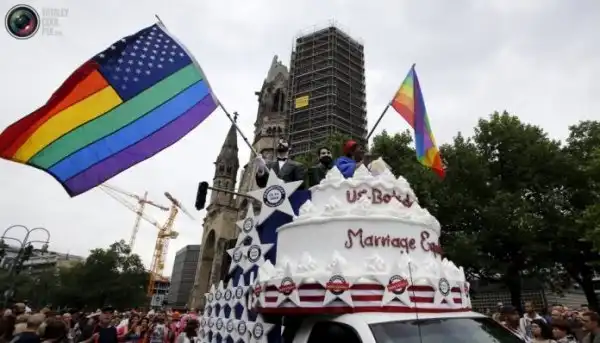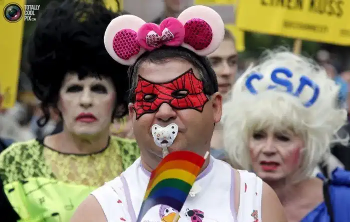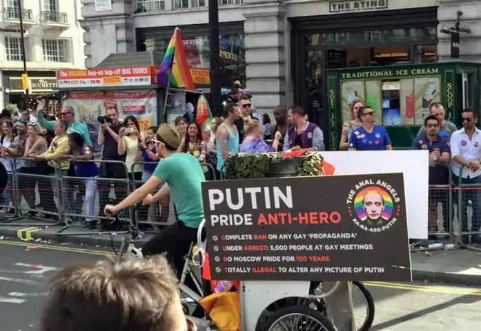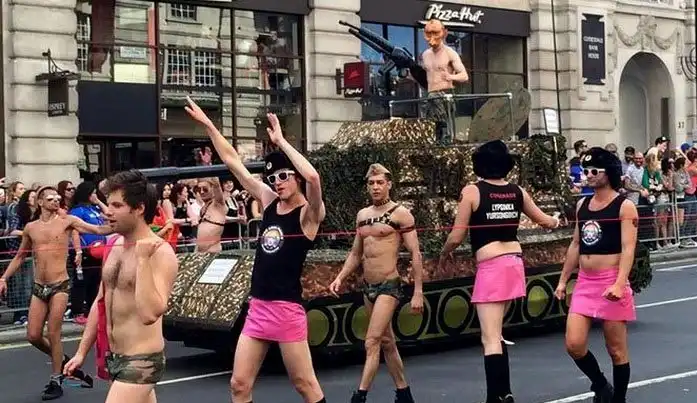 26 июня в США вступил в силу закон, и теперь на территории всей страны (США) разрешено заключать однополые браки. Это сподвигло представителей ЛГБТ-сообщества устроить красочные шествия по всему миру. Самое яркое, запоминающиеся и провокационное шоу устроили англичане. Кстати, это шествие меньшинств возглавил Путин на танке с флагом СССР в одной руке и фаллоимитатором - в другой.