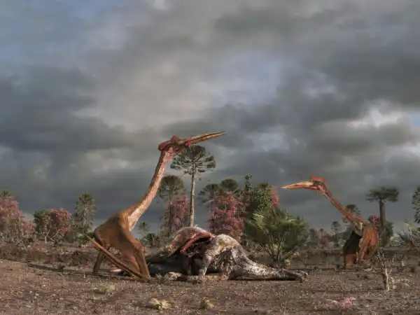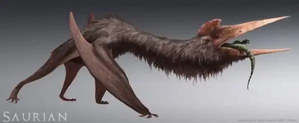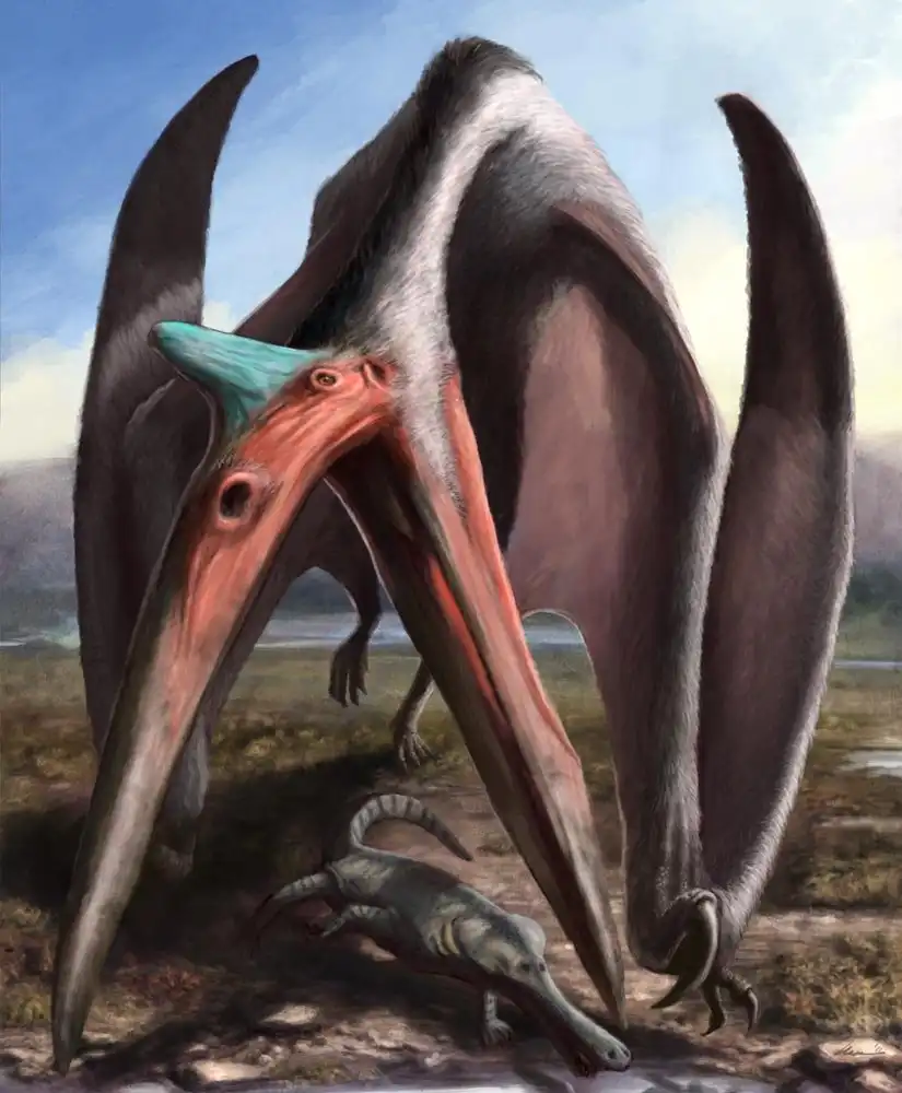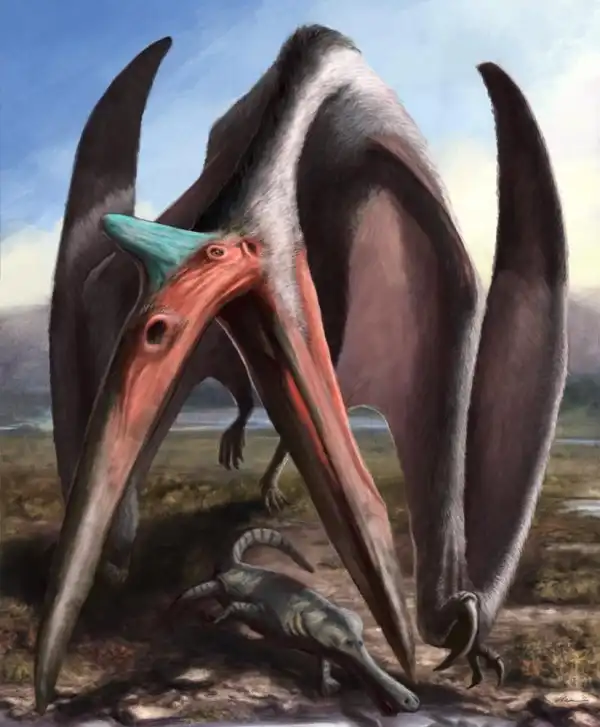 Это существо называют одним из самых крупных, если не самым крупных из всех, кто когда-либо бороздил небесные просторы. Название его связано с ацтекским богом Кетцалькоатлем, который был известен в виде пернатого змея. Летающее существо жило в позднем меловом периоде. Это был самый настоящий король неба, с размахом крыльев в 15-18 метров и ростом почти в 10. Однако вес был довольно невелик — до центнера, благодаря полым костям. У существа был заостренный клюв, которым оно собирало пищу. Длинным челюстям не мешало отсутствие зубов, а основной едой могли быть рыба, трупы других динозавров.