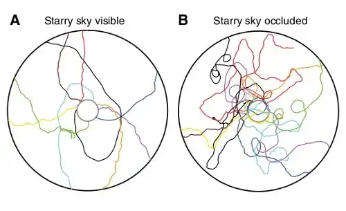 Дальнейшие измерения показали, что при полной Луне жукам требовалось в среднем 21,4 сек. (плюс-минус 4 сек.), чтобы покинуть полигон. В безлунную звездную ночь жуки передвигались уже менее уверенно, и это значение составило 40 сек. (плюс-минус 15 сек.). А вот когда на жуков надели козырек, застилающий ночное звездное небо, они начинали петлять чаще, что увеличило время пробежки до 124 сек. (плюс-минус 30 сек.). Примерно такое же значение было получено, когда манеж закрыли крышкой — 117 сек. (плюс-минус 28 сек.). Таким образом, второй, более тщательный, эксперимент подтвердил предположение, что навозники могут использовать свет звезд для ориентирования.