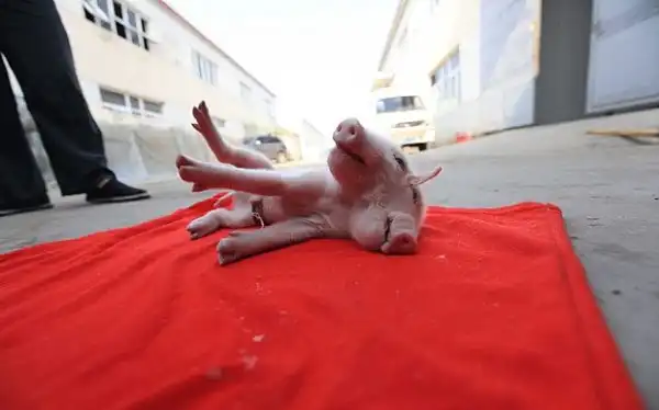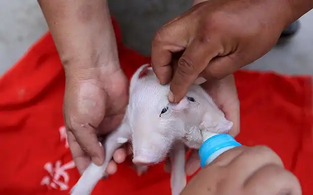 Бедняга поросёнок не может самостоятельно стоять на ножках из-за того, что родился с двумя сросшимися головами и они банально перевешивают тело, сместив центр тяжести. Поросёнка нашли в деревушке возле города Тяньцзинь в Китае и теперь его забрал на воспитание какой-то добрый человек. Можно предположить, что какой-то не очень добрый человек свинку-мутанта перед этим выбросил. Кормить двухголового приходится вручную из бутылочки, так как самостоятельно кушать он не может. У поросёнка три глаза и два пятачка, имя ему еще не придумали.