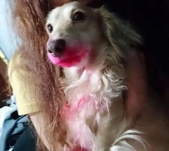 Даже некоторые животные стараются выглядеть красиво и привлекательно, используя для этого косметику. Вот, например, эта собака решила воспользоваться губной помадой своей хозяйки, но немного перестаралась.