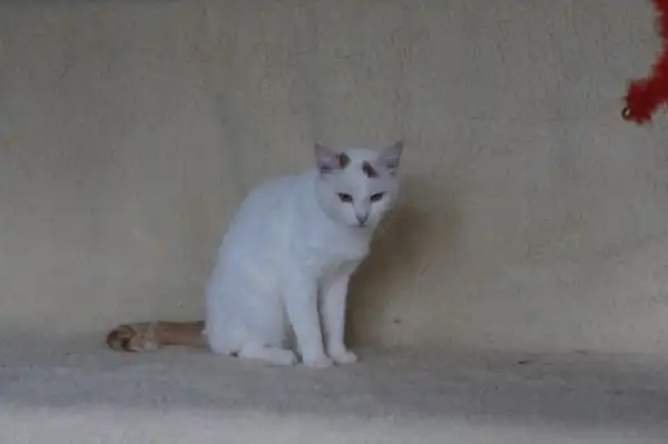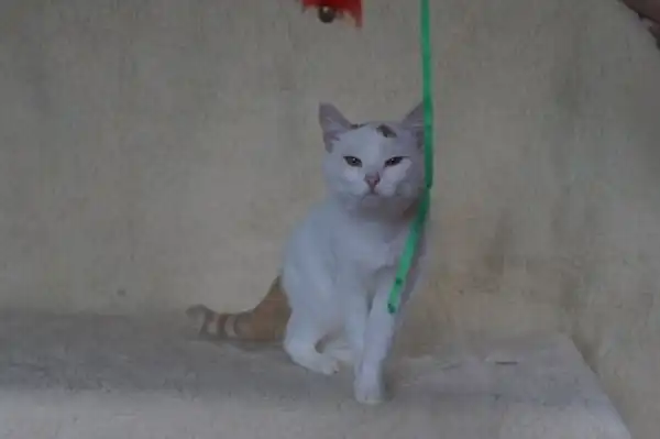 Лёва - белый котик с рыжим хвостиком и рыжими пятнышками на голове. Возраст 1,5-2 года. Выловлен из подвала. Активный, ласковый, игривый молодой кот. Людей и внимание к себе очень любит. Питается готовыми кормами, пользуется лотком. Кастрирован.