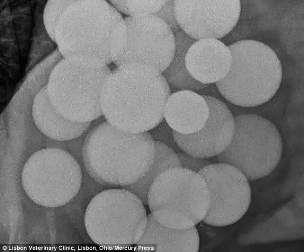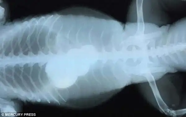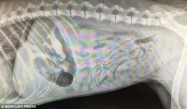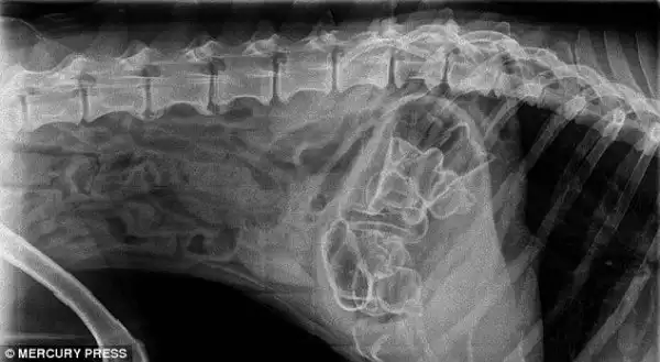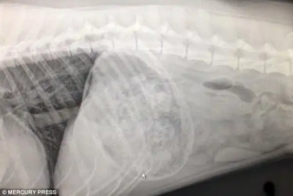 Как выяснилось, этой массой был огромный кусок клея, который по всей видимости собака стала есть в жидком состоянии, и который в последствии застыл у неё в животе