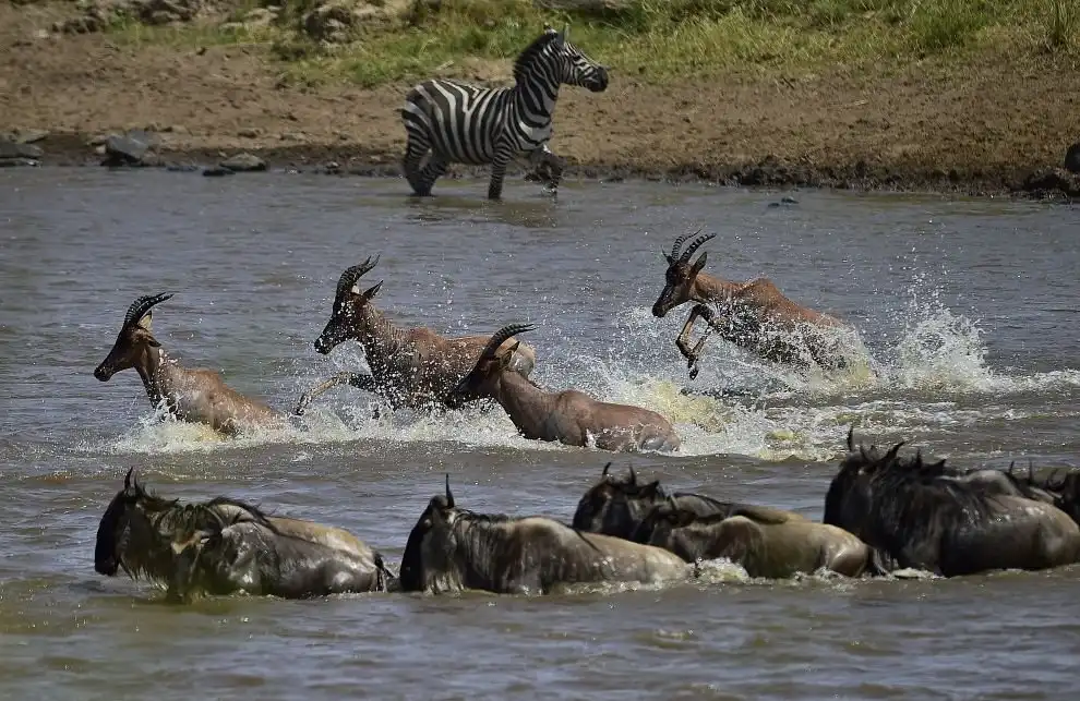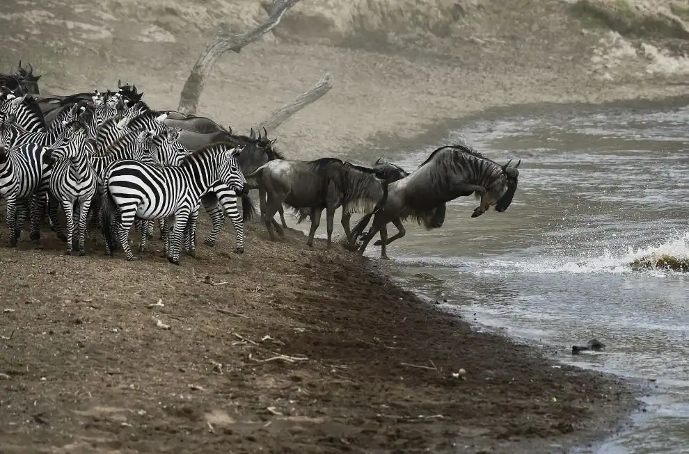 Антилопы гну и зебры начинают переправу через реку Мара в Кении