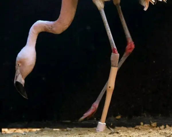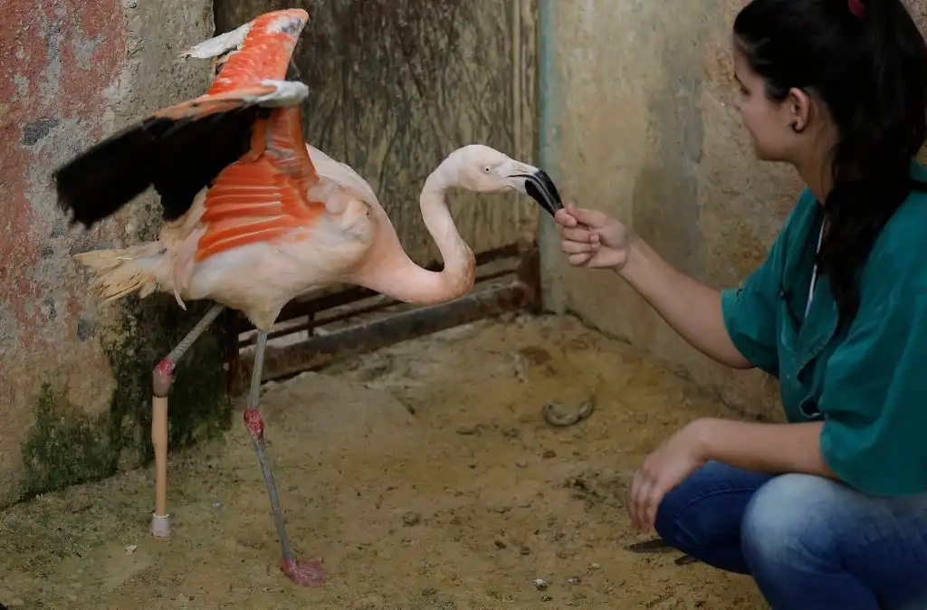 Фламинго в зоопарке бразильского города Сорокаба сломал ногу. Из-за риска риска инфекции, врачи приняли решение её ампутировать. После удачно проведённой операции, птица получила специально сконструированный протез, благодаря которому, она снова может гордо расхаживать перед посетителями зоопарка.