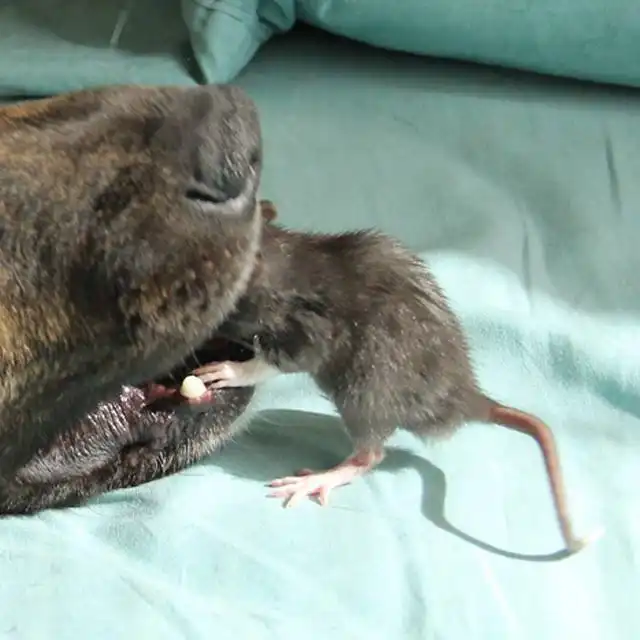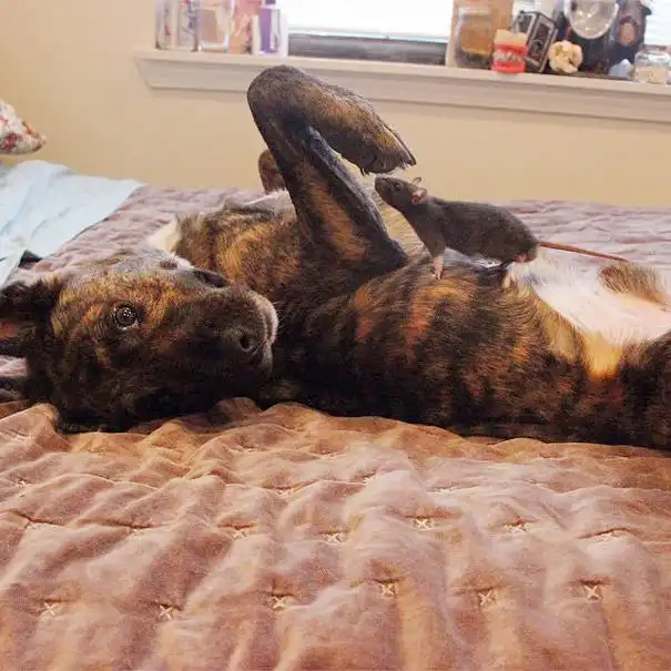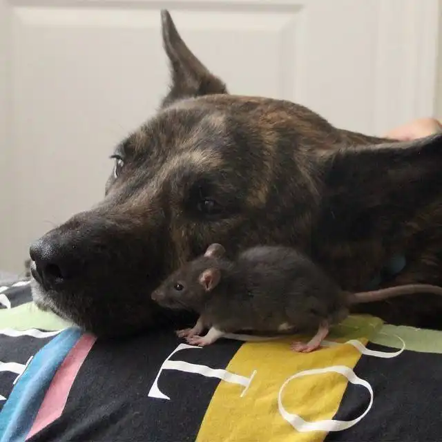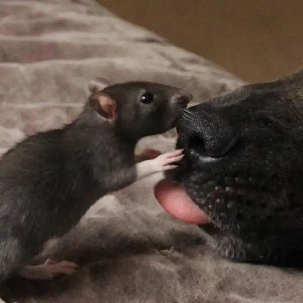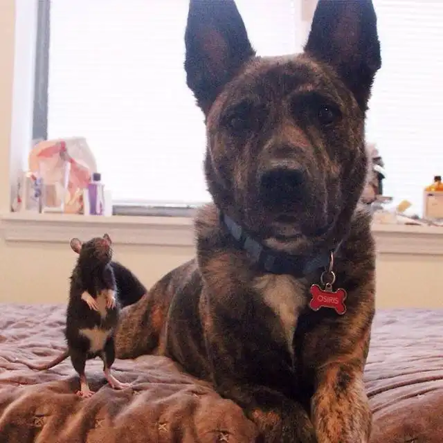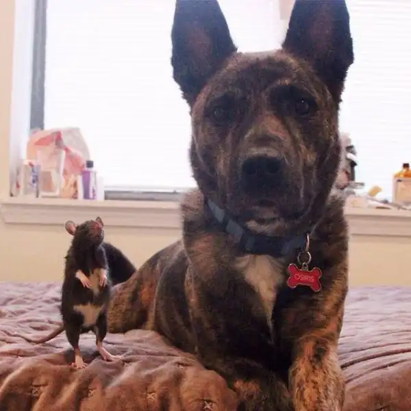 По словам хозяев, Осирис даже позволяет крысенку залезать в рот. Оставлять друзей наедине они не боятся – Осирис помог выходить и вырастить десятки животных, и собаку дружелюбнее еще надо поискать.