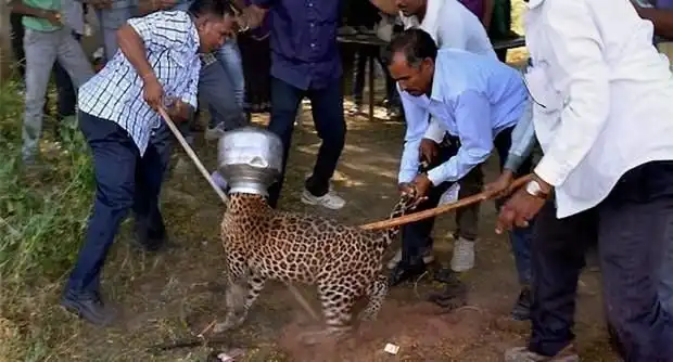 Курьезный случай произошел в одной из индийских деревень в штате Раджастан. Самец леопарда застрял головой в металлическом горшке, попытавшись из него напиться. Животное слонялось по поселку не меньше шести часов в ожидании спасателей, веселя местных. Позже хищника удалось освободить и выпустить на волю.