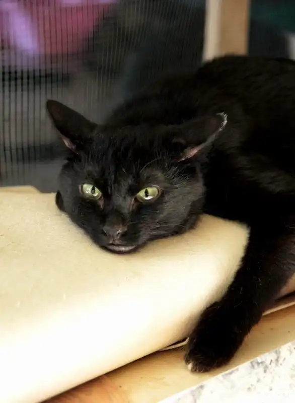 Маврикий - кот черного окраса с белым пятнышком на груди и на кончике хвоста. Возраст кота примерно 2 года, найден на улице. Кот-гимнаст, длинненький и стройный, гибкий, блестящий, очень красивый, и очень красив в движении. Обожает внимание человека, иногда ходит за нами по пятам, трется об ноги. Отлично ладит с другими кошачьими. Питается готовыми кормами, пользуется лотком. Кастрирован.
