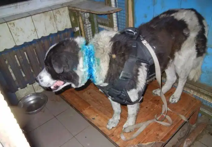 У собаки на шее была намотана проволока. Причем, сложилось мнение, что намотали ей ее еще в детстве. Собака задыхалась, была порвана трахея. Первым делом проволоку сняли. Дальнейший осмотр показал, что в собаку стреляли. В теле застряла пуля. После оказания первой помощи собаке, девушка забрала ее домой.
