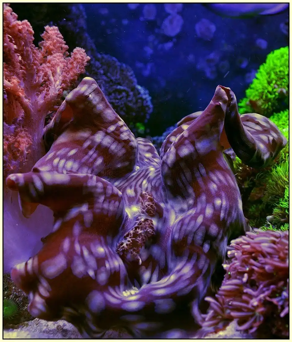 Днем тридакна широко раскрывает свои створки, выставляя напоказ необычайной красоты складки своего тела. Благодаря оригинальной, яркой окраске эти моллюски похожи на сказочные подводные цветы.